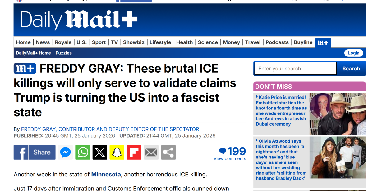 And now conservative commentator Freddie Gray - no radcial left lunatic he - https://archive.ph/77Htk Team 2.0 believes that ICE's mission – to find and deport as many illegal migrants as possible – has popular support. But voters tend only to back the use of force if it is just and helps restore order. The US public increasingly don't think that ICE is clearing that bar. There are dark whispers of discontent at the highest levels of Homeland Security. It's understood that Tom Homan, Trump's 'immigration tsar', is at odds with Department of Homeland Security secretary Kristi Noem, and other senior Trump figures, who think that public showdowns between ICE agents and protesters only reinforce Trump's tough message. But the killings in Minneapolis give the opposite impression – of an administration that is losing its grip and resorting to unnecessary violence, which only fuels further disturbances. As the weather heats up and the crunch mid-term elections in November draw closer, the carnage in Minneapolis could spread once more, and prove to be Trump 2.0's final undoing.