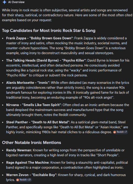 Thank you, BeastOfBodmin, for your encouragement. Now that our world has become almost completely unhinged, it is probably only through listening to the likes of Frank that... We will be able to retain even half of our sanity. We are presently living through a difficult time of Topsy-Turviness. Fortunately, we have members here on TV who recall and recognize a decent song when they hear one. Here we are in 2026, waiting in gas lines as one did in the 1970s.. We are repeating the nostalgic pleasures of over 50 years ago. So. other than ZAPPA.....WHO, and not the WHO, is the most ironical band you know, and.... Which song is TRUE IRONY at its purest level?