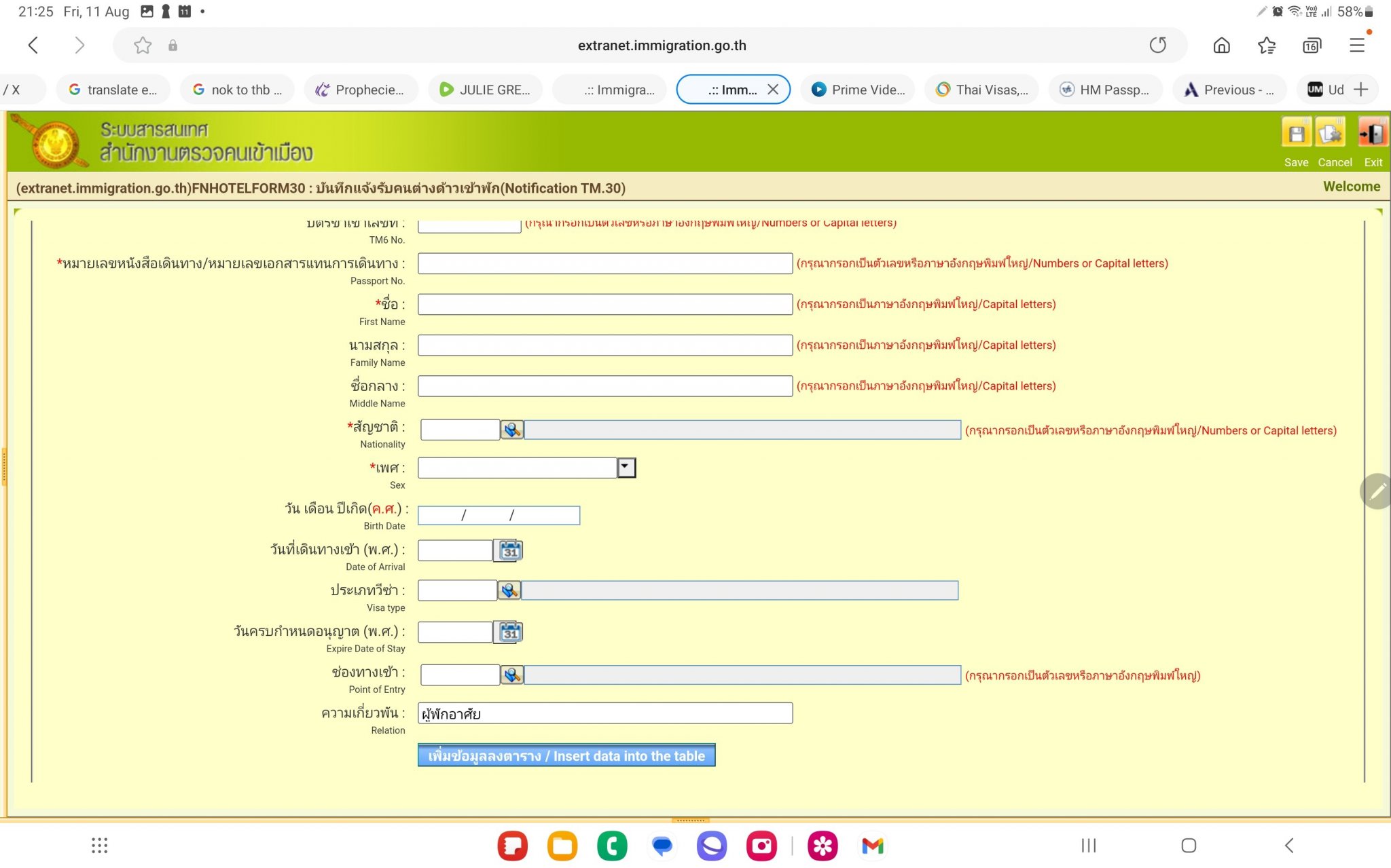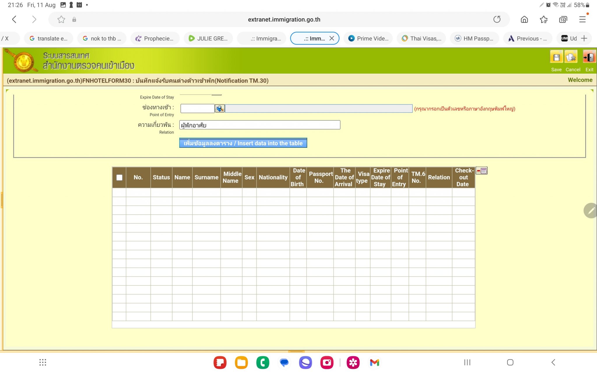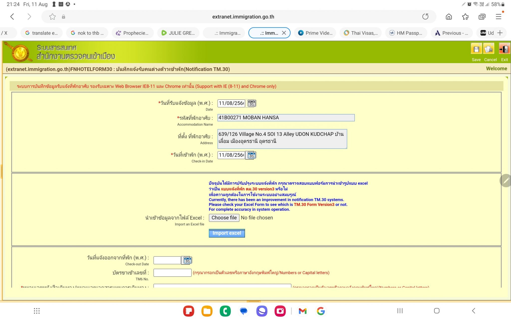 The last time I used the online TM30 Application (registered in my wife name and at our home address in Udonthani) was in in 2019 when I arrived back in Thailand at Suvarnabhumi Airport. I have been informed that as I will be getting my new renewed Passport on 15th August that I will need to do a new online TM30 that links to my new renewed Passport. I have some questions related to the required information in the TM30 Application and hope that some members can provide correct information: Check-out Date (see screenshot attached).........What date should I use? TM6 No. (see screenshot attached)............ I only have my old TM6 from 2019 which refers to my old Passport; do I use this one or can I leave this blank? Date of Arrival (see screenshot attached)..........What date should I use? Port of Entry (see screenshot attached)........... This is all in Thai and the first entry is Immigration at Suvarnabhumi Airport where I last arrived in 2019 should I use this? Relation (see screenshot attached).........As the TM30 Application is registered in my wifes name should she write my Husband in Thai here? Many thanks in advance for any help.