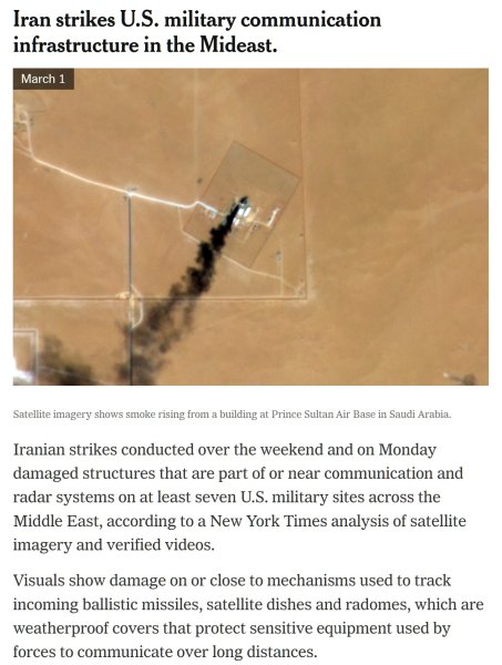 Astonishing detailed revelations from the New York Times - archived for your convenience catching up with what SM has been punting. Rumours are China/Russia are providing satellite intel.Iran didn’t just strike US bases. It mapped the communication and coordination layer that makes American missile defense function as a unified system and then it peeled it apart, base by base, across five countries simultaneously.This is not retaliation but doctrine. Thirty years of studying exactly how the American military machine sees, communicates, and coordinates and then, when the moment came, going straight for the eyes. The interceptors are blind. The magazines are depleted. The Navy can’t guarantee escorts in the Strait. Raytheon is being summoned to emergency meetings. South Korea is sitting exposed. And the New York Times just put the satellite pictures on the front page. Like I said astonishing the Iranians are no slouches and wern't to be poked but poke them they did. https://archive.ph/o4Nul#selection-2079.0-2079.71 https://www.nytimes.com/live/2026/03/04/world/iran-war-israel-lebanon-trump Iranian strikes conducted over the weekend and on Monday damaged structures that are part of or near communication and radar systems on at least seven U.S. military sites across the Middle East, according to a New York Times analysis of satellite imagery and verified videos. Visuals show damage on or close to mechanisms used to track incoming ballistic missiles, satellite dishes and radomes, which are weatherproof covers that protect sensitive equipment used by forces to communicate over long distances.