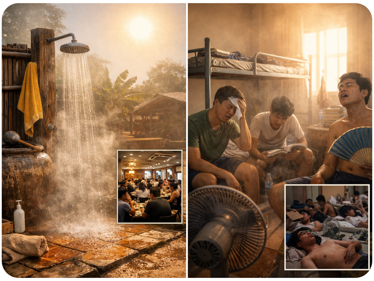 Indeed, Rain and Rain... Once the hot season arrives in Isaan, the outdoor showers are back in business — though “refreshing” might be stretching it. By midday, if the water runs at all, it’s barely cooler than the air itself, and the air feels like someone left the oven door open. Even sitting still, shirts cling and foreheads glisten. In many shops open to the street, a loyal ventilator labours in the corner, bravely circulating the same warm air in slow, determined circles. No wonder the air-conditioned restaurants are packed at lunchtime — it’s less dining, more climate migration. Along the longest table, uniforms lined up shoulder to shoulder; the youngest had claimed a small table for four. On Monday evening, 23 February 2026, I heard the first drops of rain tapping on our metal roof. The metal sheets amplified the noise, making a few hesitant drops sound far more decisive than they were. At first, I was surprised. “Is it raining?” I asked my wife. “Has the rainy season started already?” “No,” she said. “The hot season has started.” It was a cautious little announcement, still nothing compared to the real downpours that will mark the true rainy season. The sound brought to mind passages by Laurens van der Post, describing nights in the Kalahari, when people would lie beneath the vast sky and listen so carefully that even the faintest stir in the darkness became meaningful. There is something about the first hesitant rain that invites that same kind of attention. In our house at night, however, the stars are closer to earth: mice in the ceiling, cats on patrol, and pigeons shifting restlessly under the roof. And spare a thought for our students, especially those looking for rooms next semester. In this climate, air conditioning quickly shifts from luxury to necessity.