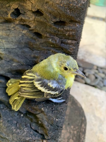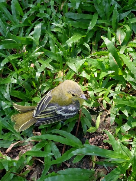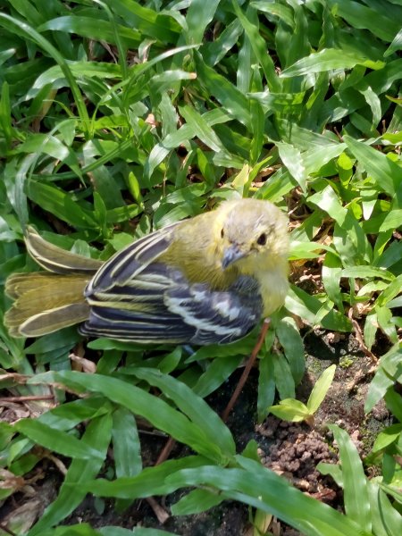 The wife, back to her beloved garden, just spotted this fledgling on the lawn. It's safely made it back to the bushes around the lawn, watched closely by an adult bird. Common Iora?