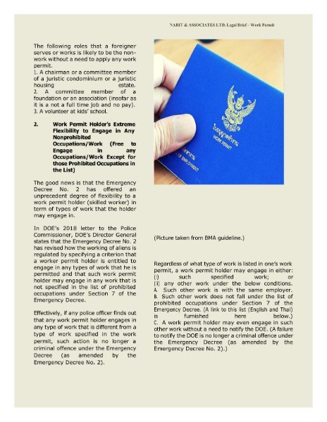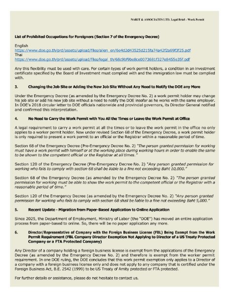 Legal Brief – What You May Not Know About Thailand’s Work Permit (Less-Known Relaxations of Thailand’s Work Permit System) By Narit Direkwattanachai, a corporate, tax & trial attorney at NARIT & Associates [Seen on LinkedIn] Even if Thai work permit law has been amended to relax certain aspects of the permit system for some time, many foreign workers and their employers remain unaware of these positive changes. This legal brief will guide you through the key favorable developments. 1. No Work Permit Required for Unpaid Work or Jobs (i.e. Volunteer Work) 2. Greater Flexibility for Work Permit Holders with Permitted Job Descriptions 3. Changing or Adding Job Sites Without a Need to Notify the Department of Employment (DOE) 4. No Longer Required to Carry Your Work Permit at All Times 5. Fully Online Work Permit Application Process
