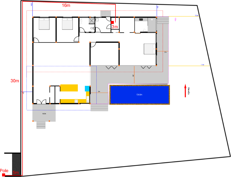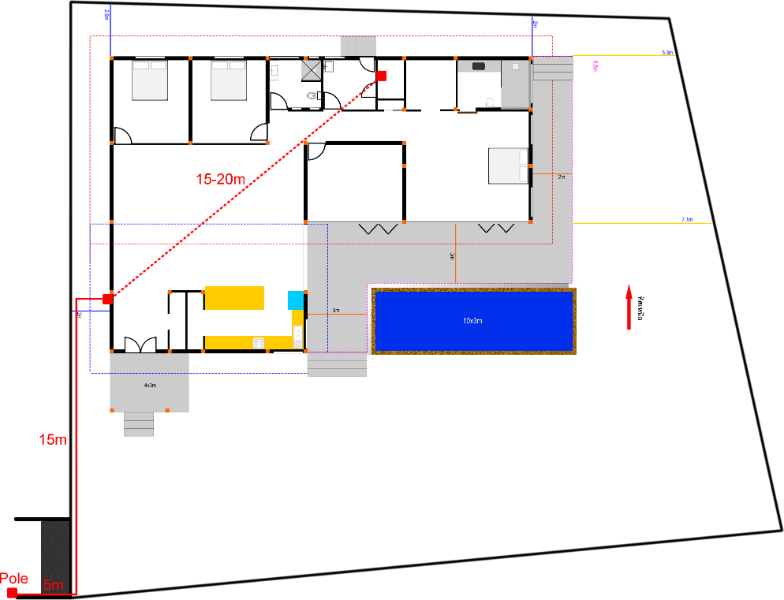 Could it be something like, underground from the meter to the side of the house (about 25m) and then aluminum cable from there using a junction or something on the side of the house and continue through the roof? I'm struggling with the fact that the distance is OK on poles, but not underground... The following are my current thinking... Option 1: Underground copper is actually about 55m but I allowed a little more for running in and termination at each end. Follow the red line around the left side OR Possible Option 2: Underground copper to the house about 25m, then aluminum through the roof to the switchboard, about 15-20m. Having poles inside the property would be messy and a shame... Option 3: Overhead aluminum (cheapest) into the house from the pole and then inside the roof to the switchboard is what I am trying to avoid. I am open to any alternate ideas you may have... Current photo of the house just for context. The PEA pole is here. Cheers!