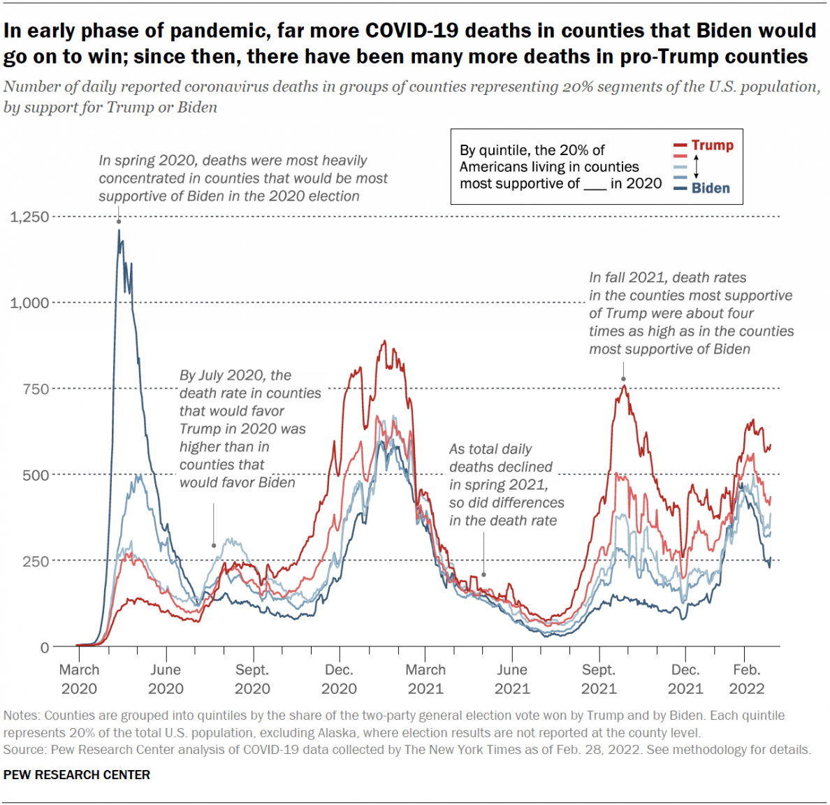Another fact-free assertion...... Here are the facts: "In the spring of 2020, the areas recording the greatest numbers of deaths were much more likely to vote Democratic than Republican. But by the third wave of the pandemic, which began in fall 2020, the pattern had reversed: Counties that voted for Donald Trump over Joe Biden were suffering substantially more deaths from the coronavirus pandemic than those that voted for Biden over Trump. This reversal is likely a result of several factors including differences in mitigation efforts and vaccine uptake, demographic differences, and other differences that are correlated with partisanship at the county level." https://www.pewresearch.org/politics/2022/03/03/the-changing-political-geography-of-covid-19-over-the-last-two-years/