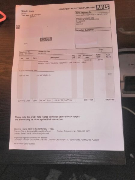 A few people will know but out of nowhere I started getting medical issues after returning from Thailand in June 2025 In fact I had spent six visits to UK hospitals including Hillingdon near Heathrow after an ambulance picked me up from Heathrow. I had been suffering on the flight and crew looked after me. There was a Thai Doctor onboard who assured the crew we didnt need a diversion and I'd be ok until Heathrow...very kindly they moved me up to Business for last 6 hours of flight on Thai Fast forward to October 2025 and I'm in local hospital in Devon....my brother and one of my sons was with me inside drawn curtains around bed (consultant had just been inside with me hence still closed) Out of nowhere some woman enters my area calling me by name and saying "Understand you have been expecting me" Now I aint exactly feeling too well but she looks officious so I hold off on any sarcasm along the lines of who the hell are you Starts yakking to me saying you're not entitled to NHS free care any more (obviously I'm British) because you spend too much time out of the UK.....(no specific mention of Thailand) Naturally I start retorting (politely) asking what are you going on about.......she produces documents I assume from Immigration office (or wherever) showing extensive visits I can hardly argue with her but I stick to the truth and point out I dont live overseas Cue her now demanding I produce documentation clearly proving I'm normally resident in UK......i had 14 days to produce it. Bear in mind I'm in a hospital bed I immediately say why dont you check with Prescription services for all my normal meds (which carry signature as some restriced drugs) and you'lll see I dont live overseas She aint having it......she produces list of requirements that I have to produce. It was so ludicrous in the extreme (bear in mind I aint exactly feeling well) that I chuck it in my bag....where it stayed. 3 weeks later I get final warning. Produce or else...... Another week goes by and letter arrives with Invoice for £14,957 lol Thinking this is ludicrous (but probably could have been avoided) I get hold of my local MP who invites me to his office and I sit with one of his case workers They point out and asked if I had been outside of UK for more than 90 days on any one trip as this DOES lead to a requalifying period for free NHS services. I make the point I had never been outside of UK in Asia for more than 77 days in any one trip....they write to the woman who I now know was an official recoverer of monies owed to NHS Still didnt provide any other proof of what she originally required In December I get the attached a cancelling of the invoice....no apology no nothing. How many people might just have paid it in the first place ! I have redacted home address