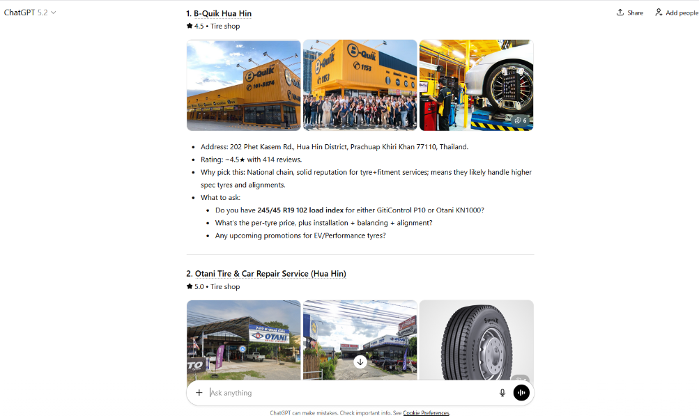 From this chain: https://www.tyreplus.co.th/en - and you are right, they don't list them on their very poor web presence (which is quite normal for Thai companies) I should mention that they had to order the tires, took about a week - but that has probably more to do with the fact that I did not go with the OEM size. As I mentioned, I had a quite extensive chat with different AI's - ChatGPT even gave me locations, prices etc. I would be very surprised if Otani being a Thai company is not on the menu in most of the chain stores. As a side note........... you really are still using Google?