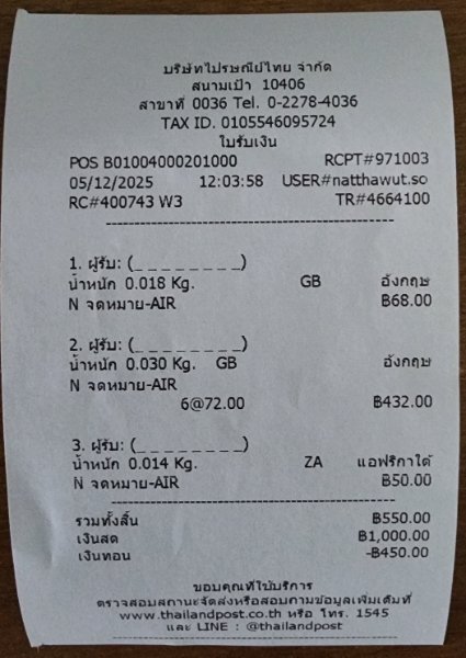 UPDATE: As per my post above, l took all the cards with me into BKK today and was suprised that the Post Office a few doors away from our apartment was actually open (today being public holiday). Handed to cards over to the clerk and asked for normal air mail service. He tapped a few keys on his computer and then proceeded to weigh each card. A few more keyboard taps and he was attaching stamps to each card plus an air mail sticker. He never asked me to fill in any customs declaration sticker or for my ID. The price of postage can be seen on the reciept below... max was 72THB for 6 cards.. that certainly beats the 180THB my local PO wanted to charge. It appears, like lmmigration, each 'branch' seems to have their own interpretation of the so called rules 😁