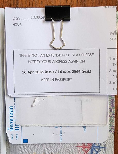 The last page of my previous passport had so many staple holes in it, it looked like a cullender. Main culprit was the IO at my local office (Nakhon Pathom) each time I went for my 90 day report. He'd tear the old slip out and staple the new one in. It got so bad that after a couple of years I used a small Binder Clip as per photo below. Easy to remove and reuse. He got the message - No more staple holes or tears. Of course when 90 day came available online it was an easy DIY job to put the new TM47 slip in the back of the passport. I wonder why the TM47 reciept has a little box in the left hand corner with the words KEEP IN PASSPORT printed in it?