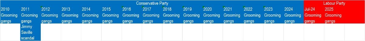 While the blame for grooming gangs is like a hot potato, we should remember that it all started in the 1980s (Margaret Thatcher's period of Tory rule) and continued until from 2010 to mid-2024 under various Tory governments without much being done. Now, people seem to think Starmer is responsible for not doing much, which is true to an extent, but it does seem to be that neither party has done much at all.