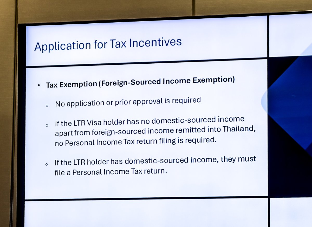 BOI LTR community meeting Wealthy Pensioner LTR tax obligation - we do not have to file a tax return for any money remitted to Thailand. There are no time restrictions on the money. You could have earned it 5 years ago or yesterday. From the powerpoint slide - “If the LTR Visa holder has no domestic-sourced income apart from foreign-sourced income remitted into Thailand, no Personal Income Tax return filing is required.” This question was asked and answered the same about 5x 5 Year Extension - there will be a 5 month window to extend the visa. 3 months before and 2 months after. Wealthy Pensioner LTR extension - Financial requirements are the same at five years. I don’t know if they want tax returns/bank statements back 1, 2, or more years. I have to contact them on that question. The presenter on tax issues was Kasapon Singprasertate Windows Senior Tax Economist The Revenue Department, Thailand