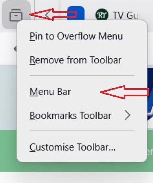 I'm not terryq but his instructions seem good to me. First right click anywhere on that toolbar (I used the button next to the top red arrow as the rest of my bar is busy but any empty space on the bar will do) then left click on Menu Bar by the second arrow.