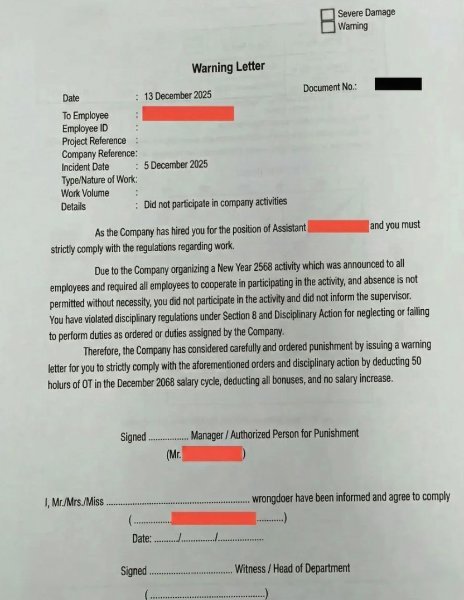 Thai Firm Sparks Outrage with Harsh Penalty for Party Absence Picture courtesy of Freepik A Thai company has ignited controversy by threatening an employee with cuts to overtime pay, bonuses, and salary raises for missing the New Year party. Tan Pao highlighted the incident on Facebook, revealing that the company issued a formal disciplinary warning to those absent. This warning includes deducting 50 hours of overtime pay, withholding the annual bonus, and ruling out salary raises. Full story: https://aseannow.com/topic/1381882-thai-firm-sparks-outrage-with-harsh-penalty-for-party-absence/