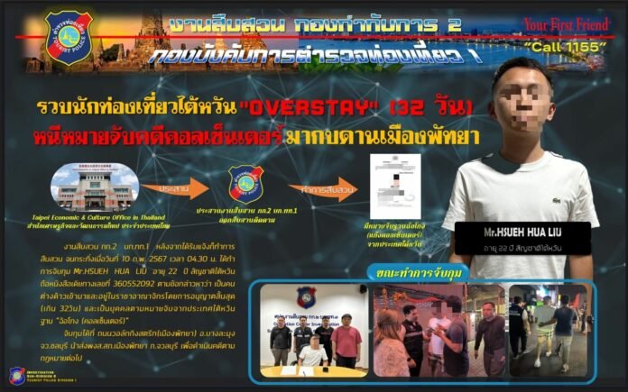 Pattaya — A joint operation by the Tourist Police Division 2 and Pattaya Police resulted in the arrest of a Taiwanese national wanted on fraud charges in his home country. The suspect, Mr. Hsues Hua Liu, was arrested on Saturday, February 10th, due to his alleged involvement in a call center gang in Taiwan. Pattaya police said the 22-year-old suspect had fled to Pattaya to evade authorities in Taiwan. Acting on information obtained from Taiwanese authorities, officers successfully apprehended Mr. Liu in Pattaya on Walking Street on February 10th. By Aim Tanakorn Full story: THE PATTAYA NEWS 2024-02-12 - Cigna offers a range of visa-compliant plans that meet the minimum requirement of medical treatment, including COVID-19, up to THB 3m. For more information on all expat health insurance plans click here. Get our Daily Newsletter - Click HERE to subscribe