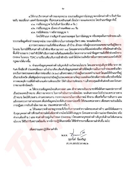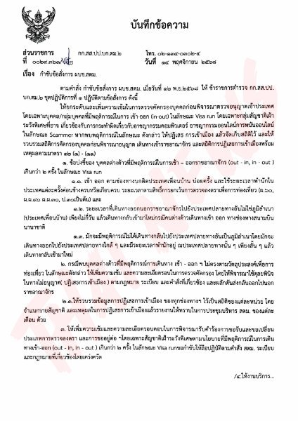 Memorandum Translation Government unit: Investigation and Suppression Sub-Division, Immigration Division 2 Date: 14 November 2568 (2025) Subject: Reiterating the orders of the Commissioner of the Immigration Bureau In reference to the directive reiterating the orders of the Commissioner of the Immigration Bureau dated 12 November 2568, all police officers of the Investigation and Suppression Sub-Division, Immigration Division 2, Operational Team 1, are ordered to act as follows: Raise the level of and increase the strictness of screening persons before granting permission to enter the Kingdom, especially persons or groups of persons whose behavior shows a pattern of entering and leaving (in-out) in the form of “visa runs”. Particular attention must be paid to nationalities designated as requiring special monitoring that may be involved in computer crime, online crime or financial fraud in the form of scammers. If such behavior is found, entry to the country shall be refused, statistics shall be recorded, and statistics on screening prior to granting permission to enter the Kingdom and on proactive operations shall be compiled, together with the reasons under section 12 (1), (2), etc. of the Immigration Act. 1.1 Indicators of foreign nationals whose behavior shows a pattern of entering and leaving the Kingdom (out-in, in-out) more than two times in the form of visa runs include: 1.1.1 Entering and leaving frequently through border checkpoints with neighboring countries, and on each entry staying for almost the full period, or the full period, allowed under the right of stay granted by tourist visas or visas for tourism (T.90, P.P.90, P.P.30, P.30, etc.). 1.1.2 The time spent outside the Kingdom in another destination country which is not the person’s home country (for example a neighboring country) is only a few days, after which the person returns to Thailand again. This applies in cases where the foreigner is travelling in and out through international airports. 1.1.3 There is a pattern of not returning to the home country, but instead travelling only to nearby third countries and staying there only briefly, then returning to Thailand again. When foreigners are found whose pattern of travel in and out does not correspond with the purpose of tourism, in the manner described above, screening must be increased in strictness and carried out with particular care. Doubtful circumstances should be considered as grounds for refusing entry (denial of admission) under the relevant laws, regulations and orders, and such persons are to be removed from the Kingdom. 2.1 Data on immigration control operations at every checkpoint shall be compiled as statistics for each unit, showing the number of persons by nationality and the reasons for refusal of entry. These statistics are to be reported at the monthly executive meeting of the Immigration Bureau. Increase strictness and thoroughness in considering applications for visas, applications to change visa category and applications for extensions of stay, especially for nationalities under special monitoring whose pattern of entering and leaving (out-in, in-out) exceeds two times in the form of visa runs, in accordance with the orders of the Immigration Bureau and all relevant laws and regulations. All alien-service sections of every unit shall compile information on cases where permission is not granted in relation to foreign nationals who submit applications for visas, applications to change visa type or applications to extend stay which do not meet the criteria and conditions of each unit. The data shall be classified as follows: 4.1 Cases where permission is not granted on the date the application is submitted (within seven days). 4.2 Cases where permission is not granted at the end of the thirty-day consideration period. 4.3 Cases where permission already granted is later revoked. This information must be broken down by nationality and by reason for refusal or revocation, and the compiled data from all units shall be reported at the monthly executive meeting of the Immigration Bureau. Check notifications of residence of foreigners submitted by house owners, heads of households or possessors of premises or hotels that accommodate foreigners under section 38, especially in units located in tourist areas or in areas with a large number of foreign residents. These inspections must be carried out strictly and continuously. Where possible, online notifications of residence in the TDAC system shall be compared with the foreigners actually staying at the premises, in order to increase the effectiveness of inspection and law enforcement. Compile data on foreign nationals of the nationalities designated for monitoring under policy, particularly those coming from KK Park on the Myawaddy side in Myanmar, and compare them with data on foreign nationals whose behavior shows visa-run patterns under tourist-visa exemption (T.90). Then check how many of these persons are currently in the country, broken down by province, in order to verify whether their distribution within the country corresponds with actual information and intelligence. If behavior meeting the criteria for revocation is found, revocation shall be carried out and the person shall be controlled and removed from the Kingdom without delay. Compile information on Thai nationals travelling out of the country, and on passengers at international airports whose destinations are clearly specified target countries, in order to set measures for dealing with Thai nationals who intend to travel to those target countries. Coordination shall be made with immigration checkpoints and with the Ministry of Labour to conduct interviews and questioning in order to prevent such travel, and the Ministry of Foreign Affairs shall be notified so that information on Thais who have travelled out can be sent to the destination countries, requesting cooperation in refusing their entry and residence in those countries. Inten