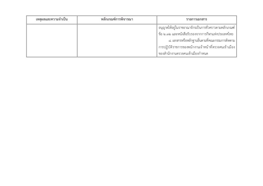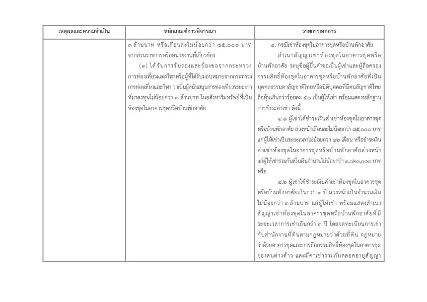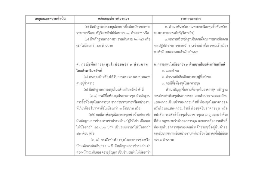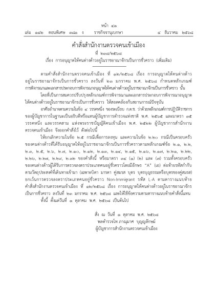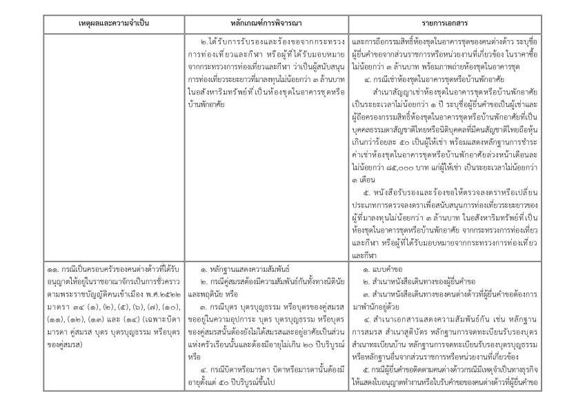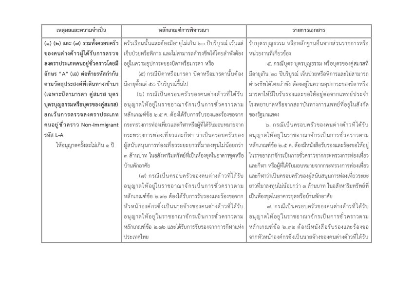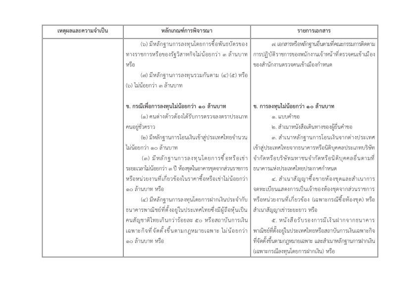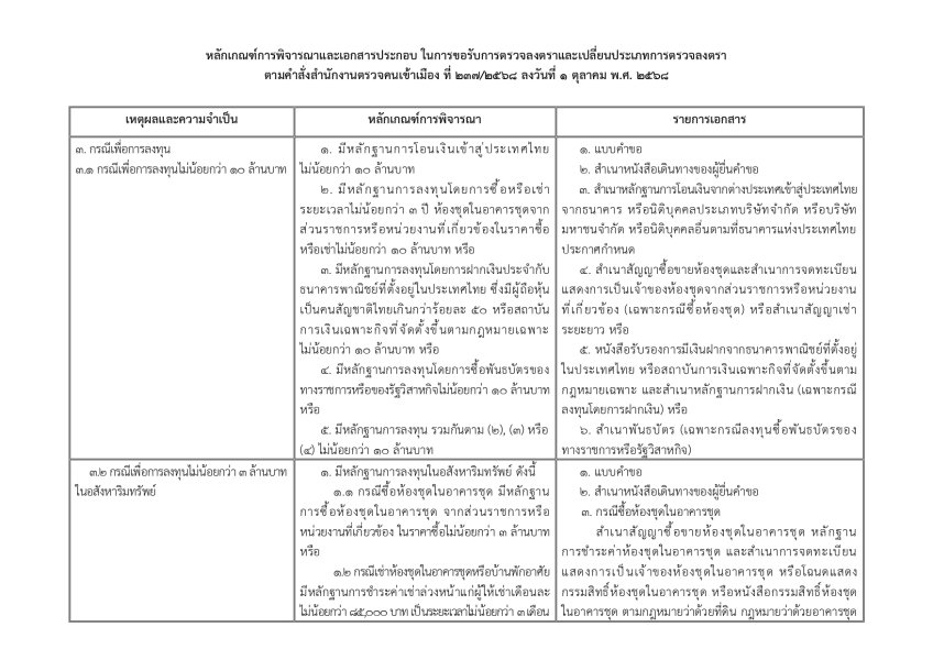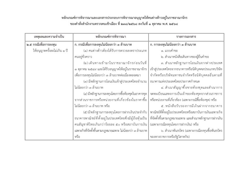 https://ratchakitcha.soc.go.th/documents/96342.pdf _____ TRANSLATION (AI - GPT 5.2) PAGE 1 / 8 (Royal Gazette page) Royal Gazette Volume 142, Special Section 381 Ng Page 41 4 December 2568 (2025) Immigration Bureau Order No. 238/2568Subject: Permission for foreigners to stay in the Kingdom on a temporary basis (Additional) Pursuant to Immigration Bureau Order No. 12/2568 regarding permission for foreigners to stay in the Kingdom on a temporary basis, dated 2 January B.E. 2568 (2025), which prescribes criteria for consideration and supporting documents for the consideration of granting permission for foreigners to stay in the Kingdom on a temporary basis; Whereas it is appropriate to improve the criteria for consideration and supporting documents for the consideration of granting permission for foreigners to stay in the Kingdom on a temporary basis so that they are consistent with the current situation; By virtue of the authority under Clause 4, paragraph one, of the Regulation of the Royal Thai Police concerning criteria for the performance of official duties of commanders in the capacity of Commissioner-General or Deputy Commissioner-General of the Royal Thai Police, B.E. 2564 (2021), and Section 35, paragraph one, and paragraph three, of the Immigration Act, B.E. 2522 (1979), the Commissioner of the Immigration Bureau hereby issues the following order: Repeal the provisions in: Clause 2.5 (Investment cases), and Clause 2.20 (Family cases) of the criteria for granting permission for foreigners to stay in the Kingdom on a temporary basis under Clauses 2.1, 2.2, 2.3, 2.5, 2.6, 2.7, 2.10, 2.12, 2.13, 2.14, 2.15, 2.16, 2.17, 2.21, 2.22, 2.26, 2.27, 2.29, 2.32 of this Order, or under Section 34 (1), (2), and (3), including the family of a foreigner who has been granted a Non-Immigrant visa classified as temporary stay with the letter “A” appended to the visa code according to the purpose of entry (limited to father/mother, spouse, child, adopted child, or spouse’s child), except for the Non-Immigrant visa code L-A. Replace with the text in the annexed table attached to this Order. This shall take effect from 1 October B.E. 2568 (2025) onwards. Ordered on 1 October B.E. 2568 (2025) Police Lieutenant General Panumas Boonyalak Commissioner of the Immigration Bureau PAGE 2 / 8Criteria for consideration and supporting documents for granting permission for foreigners to stay in the Kingdom(Annex to Immigration Bureau Order No. 238/2568 dated 1 October B.E. 2568) Columns:Reason and necessity Criteria for consideration List of documents 2.5 Case: InvestmentPermission granted each time for not more than 1 year A. Case: Investment of not less than 3,000,000 baht(1) The foreigner must have obtained a visa category: Non-Immigrant (temporary stay). (2) Entered the Kingdom before 1 October B.E. 2549 (2006) and has continuously been permitted to stay in the Kingdom for investment of not less than 3,000,000 baht. (3) Has evidence of transferring money into Thailand in an amount of not less than 3,000,000 baht. (4) Has evidence of investment by purchasing a condominium unit from the government sector or relevant agency at a purchase price of not less than 3,000,000 baht; or (5) Has evidence of investment by placing a fixed deposit with a commercial bank located in Thailand, in which Thai nationals hold more than 50% of shares, or with a specialized financial institution established under specific law, in an amount of not less than 3,000,000 baht; or Documents: Investment not less than 3,000,000 bahtApplication form Copy of the applicant’s passport Copy of evidence of money transfer from abroad into Thailand from a bank or juristic person of the type limited company or public limited company, or other juristic person as announced by the Bank of Thailand Copy of the condominium purchase agreement and copy of registration showing ownership of the condominium unit from the government sector or relevant agency (only in the case of purchasing a condominium unit); or Certificate confirming the existence of a deposit from a commercial bank located in Thailand or a specialized financial institution established under specific law, and copy of deposit evidence (only in the case of investment by deposit); or Copy of bonds (only in the case of investment in bonds of the government or a state enterprise) PAGE 3 / 8(continuation of Clause 2.5 A) (6) Has evidence of investment by purchasing government bonds or bonds of a state enterprise in an amount of not less than 3,000,000 baht; or (7) Has evidence of combined investment under (4), (5), or (6) totaling not less than 3,000,000 baht. B. Case: Investment of not less than 10,000,000 baht(1) The foreigner must have obtained a visa category: Non-Immigrant (temporary stay). (2) Has evidence of transferring money into Thailand in an amount of not less than 10,000,000 baht. (3) Has evidence of investment by purchasing or leasing (for a period of not less than 3 years) a condominium unit from the government sector or relevant agency, at a purchase or lease price of not less than 10,000,000 baht; or (4) Has evidence of investment by placing a fixed deposit with a commercial bank located in Thailand, in which Thai nationals hold more than 50% of shares, or with a specialized financial institution established under specific law, in an amount of not less than 10,000,000 baht; or Documents: Investment not less than 10,000,000 bahtApplication form Copy of the applicant’s passport Copy of evidence of money transfer from abroad into Thailand from a bank or juristic person of the type limited company or public limited company, or other juristic person as announced by the Bank of Thailand Copy of the condominium purchase agreement and copy of registration showing ownership of the condominium unit from the government sector or relevant agency (only in the case of purchasing a condominium unit); or copy of a long-term lease agreement Certificate confirming the existence of a deposi