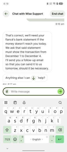 We are going to the bank shortly. Spoke to Wise again who said if money not received by tonight to send them bank statements tomorrow so they can try and trace the money. Thanks all