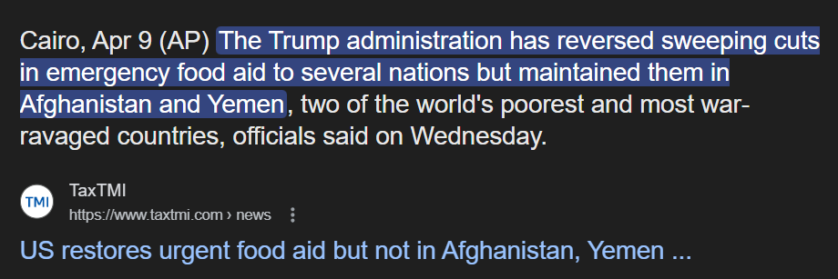 From the OP ... ... "According to The Atlantic, the food was to be distributed this year to children in Afghanistan and Pakistan" ... Trump already reinstated food aid to countries except Afghanistan & Yemen. Do try to keep up ....