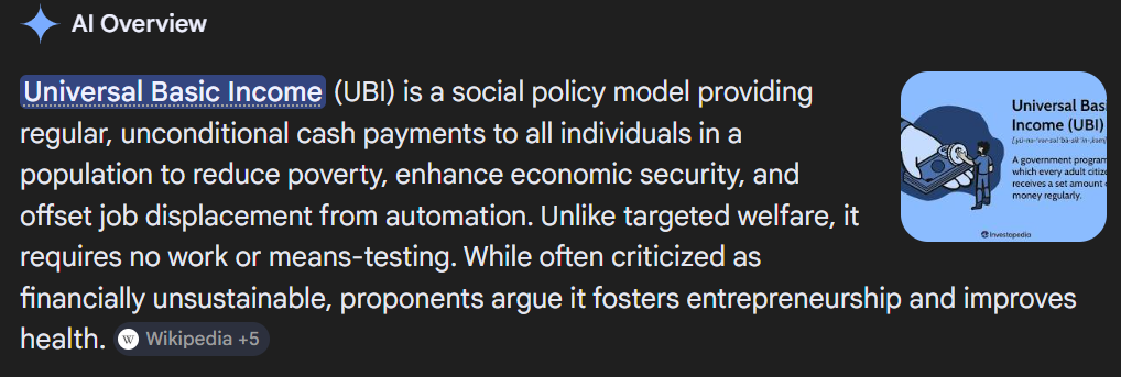 Yea, I had to google that myself ... Universal Basic Income. Govt monthly income to people too lazy to earn incomes themselves. Actually I think, in Europe, some countries, are thinking about implementing, or I read.