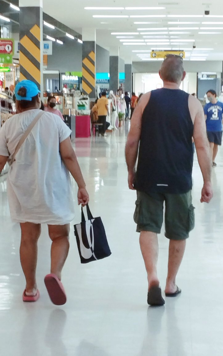 The standard of dress of many foreigners here is appalling, slouching about in shorts and singlets etc, if only they did wear polo shirts! but some of their wife's are as bad. Just the sort of low life farangs I steer well clear of, Big C Param 2. Sickeningly scruffy, no wonder immigration give some a hard time.