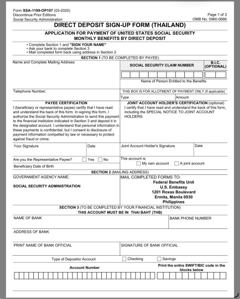This is how I did it… Works great and is deposited to my Thai bank… One caveat is that SS will send you a letter each year to confirm your still alive… If you do not return the notice they will suspend payments until you resolve… https://www.ssa.gov/forms/ssa-1199-op107.pdf