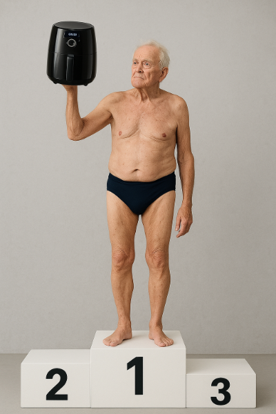 It's all in his autobiography. In the chapter "How I won the bronze medal in the 800 metres freestyle at my local condo after I inhaled fried chicken from my Tefal Dual Fryer".- Air Fryer