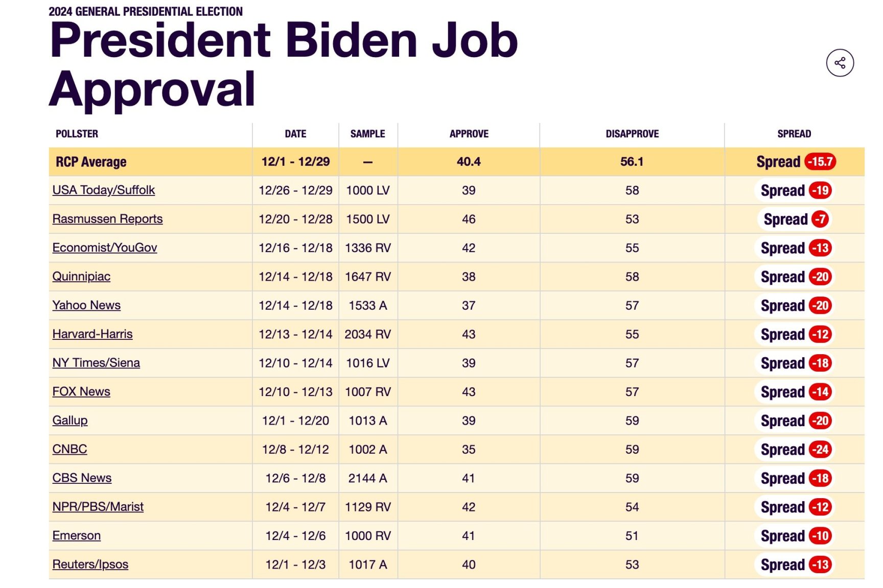 He's delivering, especially at the polls, which are in the toilet, (MSM seem to equate Biden to a toilet quite often, even going back to March 2022. How's Biden delivering with his border security and immigration reform? And why has he emboldened Iran and hamas with $6B and other funding and the war in ME,, and why is not announcing that and how his border security processed only 300,000 illegals in Dec 2023? How many jobs did he create, the 14M big lie?, and how much did he reduce the deficit, $1.2T or was it $1.7T, or what lie did he use? Notice he didn't include any of his lies about the economy, jobs, immigration and border security disaster he's created? Not a word about his accomplishments (AKA disaster. failure, etc). Biden's a failure and to think otherwise is total delusion. Link to Polling Report fitsNEWS