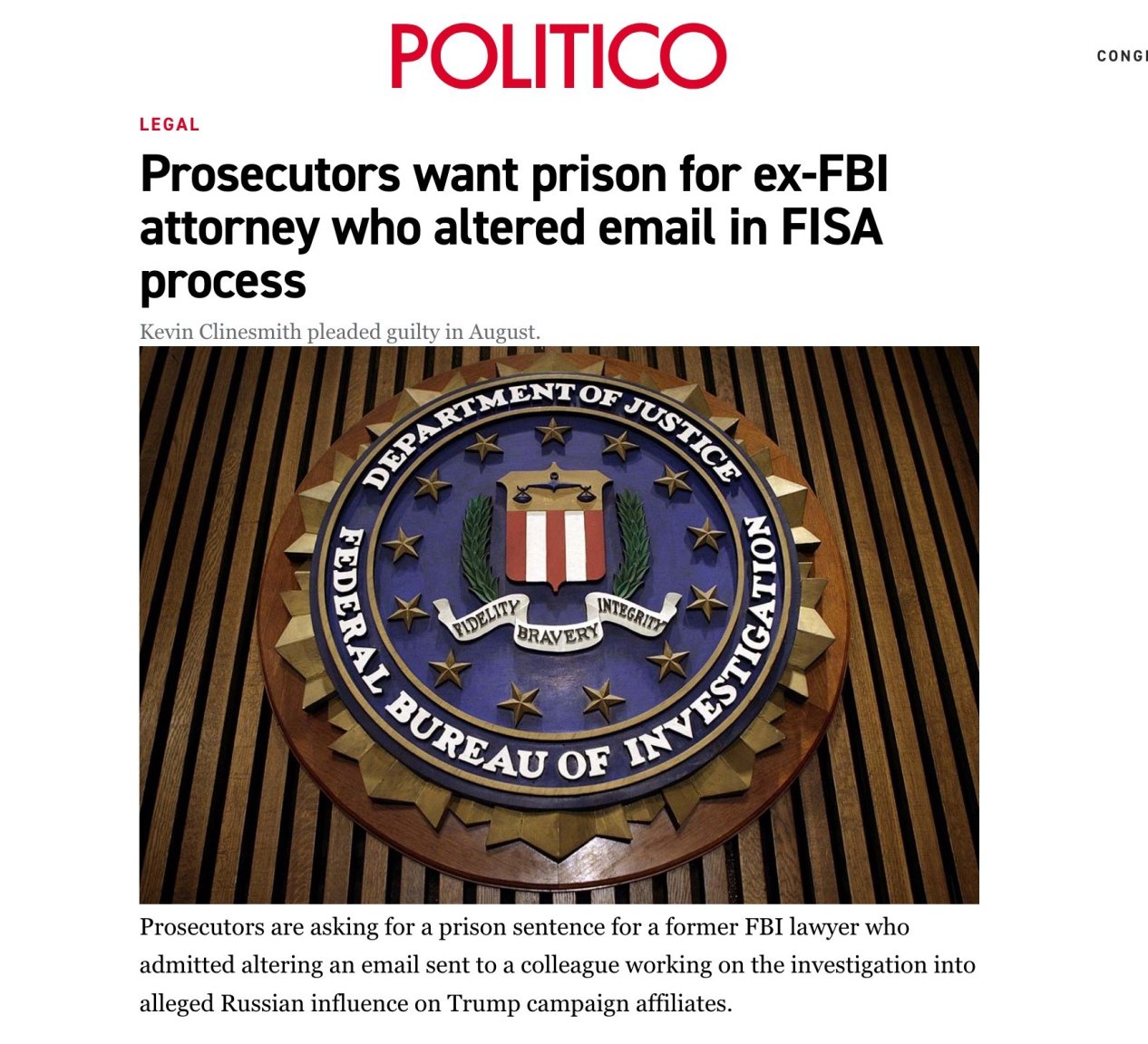 For the record: FBI lawyer falsified docs for FISA warrant to spy on Trump. Only one of many FBI who lied trying to "get Trump" with the fake RussiaGate debacle worthy of daft status comparable to Biden's humiliating and deadly Afghan 3 ring circus withdrawal! Imagine that, a dumb as a tree stump Biden luvin FBI gestapo scmuck falsifying docs to get a FISA warrant on Carter Page, all on false pretenses. Politico reference https://www.politico.com/news/2020/12/03/ex-fbi-attorney-asks-to-avoid-jail-442767