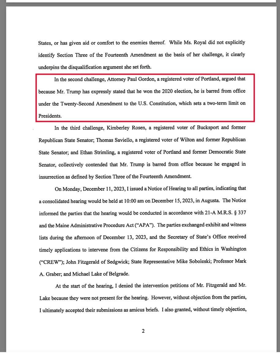 One Maine challenger suggests Trump is barred based in the 22nd Amendment (2 term limit). No legal substance, all for show. The big kids in charge will see this as the daft left wing generated nuisance that it is. These democrat losers must hate themselves for being so stupid. https://s3.documentcloud.org/documents/24245399/trump.pdf