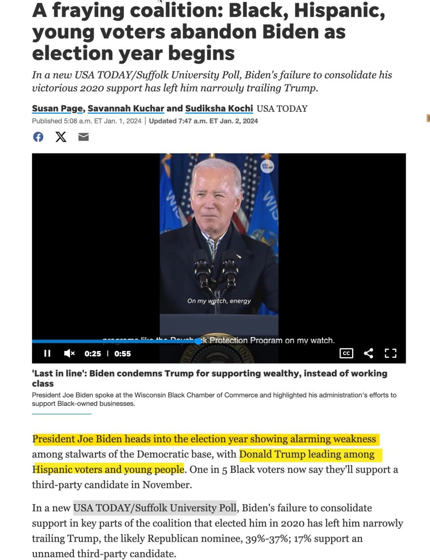 New Poll from USA Today / Suffolk U It should come as no surprise that orange man bad is besting the corrupt turnip brain Biden in yet another key voter metric recently reported JAN 02.2024 in a new USA TODAY/Suffolk University Poll. Based on how the deep state / Biden protection regime media has mislead American voters about Trump starting with the fake RussiaGate hoax, and the **lawfare persecution by Biden’s weaponized DOJ and some whack job state & county AG’s of the very obviously superior candidate Trump, does anyone here find it odd that Trump is destroying Biden in all polling and job approvals candidate. Maybe Biden’s failed administration has had one too many dumpster fires along with voters perception of Biden’s and his families overt public corruption. Some polls reported their findings and data showing voters feel Trump has helped them more and Biden has hurt them more, as well that they view Trumps economy was better than Biden’s current failed economy and his ability to manage key voter concerns vastly exceed that of Biden. Check the latest NYT/Sienna, CNN/SSRS, NBCNews, Suffolk, Rasmussen, WSJ/Fabrizio Lee, Morning-Consult-Bloomberg, Harvard CAPS Harris polls and others for full and supporting details. As bad a candidate Trump and Biden are, the very striking reality is that Trump is far more capable to be POTUS and manage America’ than Biden and far more liked than Biden with voters now see just how corrupt Biden and the deep state is. Biden has accomplished nothing that voters view as helpful or positive, otherwise the polls would indicate this and reflect as much, but they don’t and they are in the toilet about to get flushed in November. Biden and his deep state banana republic commie cabal fear Trump so bad they are trying desperately and illegally to jail him and remove him from State ballots so the voters cannot exercise their constitutional & democratic right to vote for the candidate of their choice. There is no bigger threat to democracy than Biden and his banana republic gestapo tactics. The corrupt and demented old fool’s day of reckoning is coming along with his other corrupt family members. More great additions to loser Joe’s disgraceful, and humiliating legacy. Biden should cut his losses now and step down before he takes a zinger he, the crackhead junkie and the coconspiring Biden crime family can’t recover from. Thanks for reading this. additional comments: “There’s a lot of truth to that feeling: Coming off of the summer season, political news does not tend to be the priority for most Americans, and Biden’s major accomplishments — the Inflation Reduction Act, the Bipartisan Infrastructure Act, the investments in manufacturing and technology in the CHIPS Act — may not seem to be affecting the lives of the average American.” SKY news AU Biden, “Utterly incoherent….falling in the Polls” https://youtu.be/iNqFCOASIt0?feature=shared https://www.usatoday.com/story/news/politics/elections/2024/01/01/biden-trump-poll-odds-black-hispanic-young-voters/72072111007/