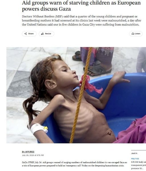 You sir for sure have reached an absolute new level of low. Your arguments to deny the starvation in Gaza are pathetic and put shame on you. Documentation has been disseminated by the World Health Organization, the World Food Programme, UNICEF, Doctors Without Borders, Oxfam, Save the Children and many other reputable sources. The famine in Gaza has now been recognized by almost the entire world. Last month 24 countries signed a declaration calling for urgent action to stop the starvation there, among them were France, the U.K., Japan, Sweden and Switzerland. Even the prime minister's last remaining supporter in the global arena, U.S. President Donald Trump, reportedly shouted at Netanyahu that he had seen clear evidence of starvation. Do you want your family to have breakfast like this? Or your kids look like this? Israel did this And this And this If you need more starvation porn just let me know or google "kids starve in Gaza". Or maybe pics of shot children will give you satisfaction. Just tell me. Those kids with preexisting conditions are the most vulnerable – OF COURSE they are the first to die! Is that so difficult to understand? I will give you a thought experiment: Take 2 million of your people, including children, the elderly, the sick and the disabled. Move them all to live in tents on beaches, or in the streets or in abandoned buildings, with no electricity, no running water, no cooking gas, no refrigerators or cupboards – and only one toilet for every 100 to 200 people. Sewage will flow around them same as human remains. Swarms of mosquitoes, rats and wild dogs will chase them. For a year and a half, provide them with meager, monotonous food – almost no protein, no meat, milk or fresh fruits and vegetables. After a year and a half, when the entire population is already suffering from a deficiency of calories, iron, vitamins and protein. Now withhold food for 78 days. During this time, they will have to make do with whatever stored food remains. After 78 days, return the food, but in minimal quantities – one truck for every 30,000 people, once a day. The truck will dump the food far from the tents, in a dangerous area, and only the young and strong will be able to reach it. Now ask yourself: How long would it take before toddlers, the sick, the elderly, orphans and yes, even children with preexisting conditions who require special nutrition start dying? Israel has done this to the people of Gaza while it keeps bombing them and slaughtering them when they stand in line for food and at the same time stealing their land while the world is watching. Israel was, is and will forever be the stolen state built on the corpses of innocent people, mostly children. Only now the whole world knows it. And will never forget. Seriously, how do you live with yourself?