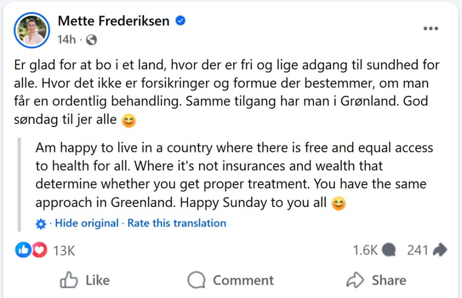 Greenland's Prime Minister Jens-Frederik Nielsen said on Sunday "thanks, but no thanks" to U.S. President Donald Trump's idea of sending a hospital ship to Greenland, a territory that Trump has repeatedly said he wishes to take over. U.S. president Donald Trump announced that the United States will send a hospital ship to Greenland, "to take care of the many people who are sick and not being taken care of there". It is not clear who those "many people" are, since permanent residents of Greenland are entitled to free, taxpayer-funded healthcare at the point of use. The system covers general practitioner visits, hospital stays, specialized treatment, and prescription medicine. Some services, such as dental care and, at times, eyeglasses or prosthetics, may require partial payment. American citizens in Greenland, whether visitors or short-term workers, generally require private insurance or must pay for services out of pocket. But their numbers are so low that they don't justify deploying one of the two hospital ships operated by the United States Navy (the USNS Mercy and the USNS Comfort). Denmark's Prime Minister Mette Frederiksen defended Denmark's health care system on Sunday, writing on Facebook that she was "happy to live in a country where there is free and equal access to health for all. Where it's not insurances and wealth that determine whether you get proper treatment." "You have the same approach in Greenland," she said, before adding: "Happy Sunday to you all" in front of a blushing, smiling emoji.