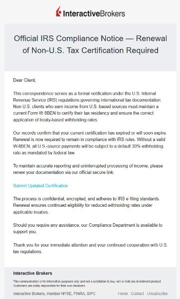 I've recently received several phishing scam emails pretending to be from Interactive Brokers in regards to tax information needing updating. Below is a screenshot of the most recent one I received today. The email comes from: Interactive Brokers <login(at)vgejgg.com> It includes a blue text link labeled Submit Updated Certification as you will see in the screenshot below, which links to: https://rsjgmqb.com Both of these domains are fraudulent. One is registered through a Singaporean registrar and the other through a registrar in China. I did not click the link, but this is a classic phishing attempt designed to steal personal information, login credentials, or other sensitive data. Falling for it could lead to identity theft or unauthorized access to your Interactive Brokers account, if you have one.
