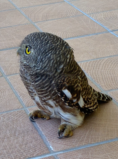 This young owl was sitting in the morning on our padio floor. I saw later some marks on the window. So not only "dumb birds" fly into windows. I was able to make exactly this one foto, then he flew away...