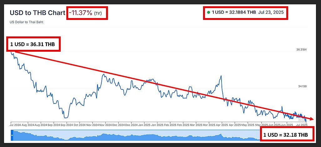 Thailand has made goods, services, and tourism 11% + more expensive in the past year via the "strong Baht" Plus, waiting for the August 1st "deal" with the USA, which makes exports very difficult and exchange rates a problem. The solution to many, many of Thailand's problems is a Baht that is at least USD / THB 36.00.