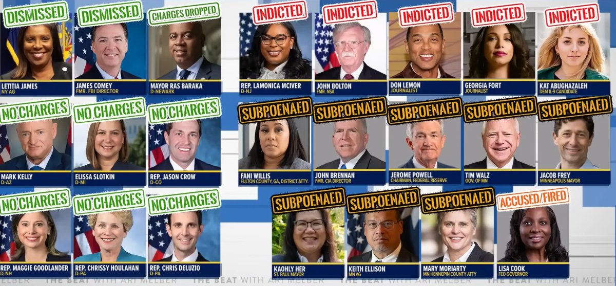 The AG is supposed to be independent of the President. Obviously Bondi is Trump's personal attack dog. While Bondi closed the case on Epstein back in July, not thinking there was any crime worth pursuing, she has used her office to go after many non crimes, which tend to involve people who had criticized her boss Trump. Her list of failures keeps growing, mostly because she couldn't actually find any crimes. It not only makes her look bad, and fascist, it makes her look dumb, as if she doesn't even know the law. She went after Senators and Congresspeople who reminded military personnel of their duty. She went after Comey, even when her star witness said Comey did not leak. She went after NY AG James, despite her mortgage application stating specifically she could rent out the property, provided she did not use an agent. James rented to a relative...directly. She even told the House that they shouldn't care about Epstein and the rapes of girls as young as 9 years old, since the Dow was---not anymore---above 50K. Here are folks Bondi thinks are more deserving of investigation and prosecution than men who fiddled with underage girls: