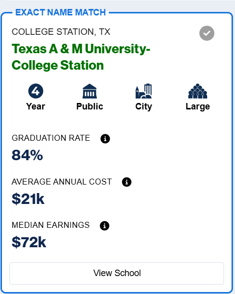 17. There's a thing called google which could actually help you answer the question of "How many of them qualify for financial aid?" The answer is 55% https://news.harvard.edu/gazette/story/2025/03/harvard-expands-financial-aid/ But thanks for pointing out that I had posted information about that satellite campus. Here is the information about Texas A&M at College Station https://collegescorecard.ed.gov/search/?page=0&search=Texas+A+%26+M+University-College+Station&sort=threshold_earnings:desc