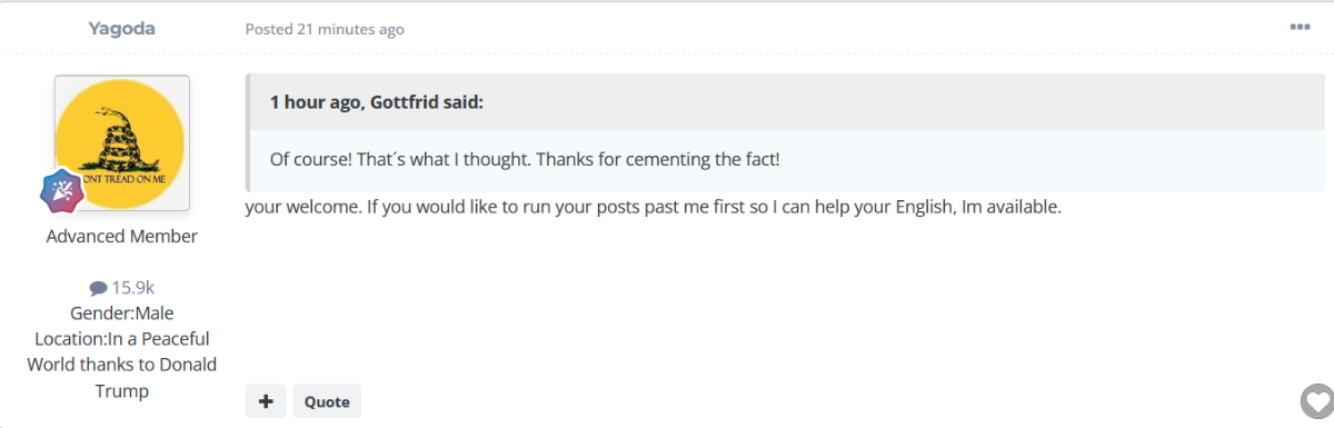 Anyone who believes he has correctly translated my comment at the top of this post, clearly has no business offering English language help to others.