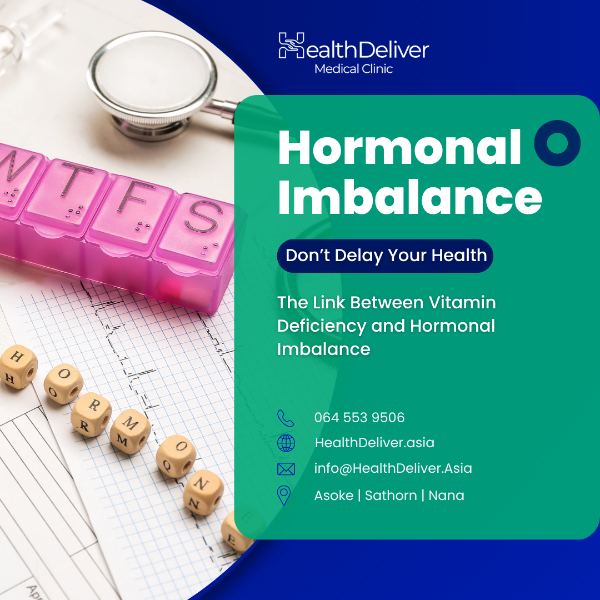 Hormonal imbalance health isn’t just about glands—it’s also about what you eat, absorb, and lack. Research increasingly shows that deficiencies in key vitamins like D, B12, A, C, and E can disrupt hormonal signaling across the thyroid, adrenal glands, pancreas, and reproductive organs. The result? A confusing mix of symptoms from fatigue to mood swings, often misattributed to age or stress. Why Vitamins Matter for Hormones Vitamins act as essential coenzymes and modulators in hormone production, influencing how hormones are made, released, and received. For example: Vitamin D affects insulin sensitivity and sex hormone balance. B-vitamins (B2, B3, B6, B12) help convert thyroid hormones and regulate cortisol. Vitamin A supports thyroid and sex steroid pathways. Vitamin C is crucial for adrenal and stress hormones. Vitamin E protects insulin signaling and pancreatic function. Without these micronutrients, hormonal pathways can falter, even if hormone glands appear “normal” in routine tests. What Increases Your Risk Several lifestyle and health factors make vitamin-related hormonal imbalances more likely: Low sun exposure (Vitamin D) Vegan/vegetarian diets (B12, iron) Gut disorders or surgeries (malabsorption) Long-term medication use Aging or chronic illness Overlapping symptoms like brain fog, low libido, skin issues, or weight fluctuation could point to subtle but fixable vitamin deficits. How to Restore the Balance The good news: you can test, identify, and correct deficiencies with targeted guidance. HealthDeliver Clinic offers: At-home blood testing for Vitamin D, B12, and hormone levels GI-MAP or Dutch OAT testing for nutrient absorption and gut function Dietary consultations to improve vitamin intake Supplement plans tailored to your biology We recommend follow-up testing every 6–12 weeks depending on your starting levels and treatment response. When to Seek Help If you're tired despite sleep, moody despite rest, or gaining weight without reason, consider it a red flag. Don't guess—test. Book a consultation with HealthDeliver’s integrative care team to explore how vitamin testing can explain what bloodwork alone might miss. Your next step? 📞 Book a consultation now 📍 Visit HealthDeliver Clinic Bangkok – Asoke & Sathorn 🔗 Schedule Online