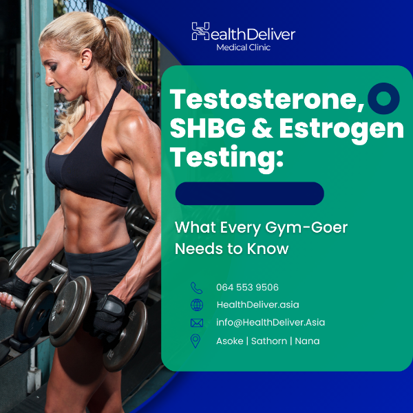 If you’ve ever stalled in the gym despite doing everything right—training hard, eating well, and sleeping decently—your hormones may be the missing piece. Testosterone, Sex Hormone Binding Globulin (SHBG), and Estradiol (a type of estrogen) are critical markers that influence energy, recovery, libido, and muscle growth. Blood testing isn’t just for elite athletes or men on testosterone therapy. It’s one of the smartest steps any serious gym-goer can take. Here's what to test, when to test it, and how to act on the results. 🕒 Test Timing: Morning Wins Always test between 7–10 AM, when testosterone naturally peaks. Book your blood draw after an 8–12 hour fast, avoid training the night before, and stay hydrated. This ensures a reliable hormone snapshot. 🧪 Which Hormones to Test? At minimum, include the following: Total Testosterone: Measures all testosterone in your blood. Free Testosterone (or calculated): Measures what's actually active and usable. SHBG (Sex Hormone Binding Globulin): Regulates how much testosterone is bioavailable. Sensitive Estradiol (E2): Impacts recovery, fat retention, and mood. Optionally, add LH and FSH to rule out primary or secondary causes of low testosterone if levels are borderline. 📊 What the Results Mean High SHBG + Normal Total T → Likely low free T, which can explain symptoms. Low SHBG → Possibly elevated free T, but may be due to insulin resistance or excess body fat. High Estrogen (E2) → Water retention, mood swings, slower recovery. Low Estrogen → Joint issues, fatigue, poor recovery. Good T/E2 Balance → Efficient muscle building, solid energy, fast recovery. Ask for reference ranges and lab units, and compare to symptoms—numbers alone don’t tell the full story. ⚖️ Why SHBG Matters SHBG is the gatekeeper. It binds to testosterone and limits what’s available to your body. Factors that raise SHBG include: Age Hyperthyroidism Liver disease Factors that lower SHBG include: Obesity Insulin resistance Hypothyroidism Misinterpreting SHBG can lead to unnecessary medication—always rule out lifestyle causes first. 🧠 Estrogen Isn’t the Enemy Men need estrogen too. It helps muscle repair, maintains libido, and supports joint health. The key is balance. Too much? You’ll feel bloated and moody. Too little? You’ll feel drained and flat. 🏋️♂️ Hormone Health Tips for Lifters Sleep 7–9 hours nightly—lowers cortisol, boosts testosterone. Eat enough fat (20–35% of calories), especially monounsaturated and saturated. Protein: 1.6–2.2 g/kg bodyweight for muscle synthesis. Train smart: Lift heavy, recover well. Avoid chronic calorie deficits or overtraining. 🧑⚕️ When to See a Doctor If you’re experiencing: Low libido or performance Fatigue and poor recovery Loss of muscle mass Weight gain despite training Mood swings or sleep issues …it’s time to consult a clinician. Repeat your bloodwork, discuss lifestyle and medications, and explore medical options if needed. 📌 Final Word Data beats guesswork. Testing testosterone, SHBG, and estrogen gives you the power to optimize performance and recovery. You’ll stop second-guessing your plan and start training smarter—with your hormones aligned, not fighting against you. 📍Ready to Test in Bangkok? Book your hormone panel at HealthDeliver Clinic Bangkok. Fast, accurate, and designed for gym-goers, trainers, and high performers. 👉 Click here to book your appointment or visit us in Sukhumvit.