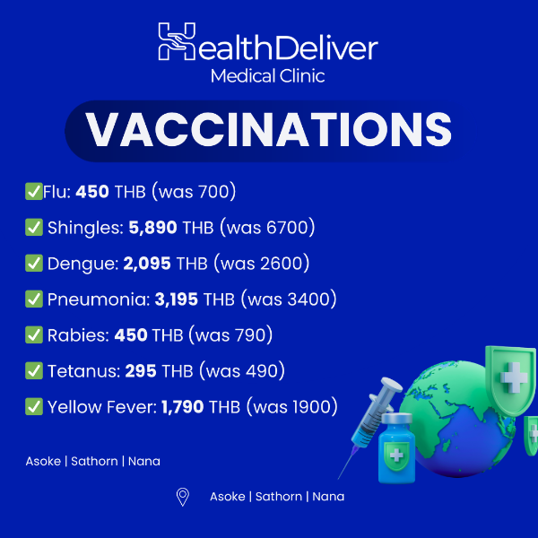 Flu Season in Thailand: What You Need to Know (and How to Stay Healthy) While many people think of the flu as a cold-weather illness, influenza remains active in Thailand all year round, with spikes during the rainy and cooler months (typically June to October and December to February). Whether you’re a long-term resident, expat, or visiting professional, understanding how to protect yourself from the flu is essential—especially in Thailand’s busy urban environments where viruses spread easily. Understanding the Flu in Thailand Influenza is a contagious viral infection that affects the nose, throat, and sometimes the lungs. Symptoms can include: Sudden high fever Headache and muscle pain Sore throat and cough Fatigue and body aches While most healthy adults recover within a week, the flu can lead to serious complications for young children, older adults, and people with chronic conditions such as diabetes, asthma, or heart disease. How Flu Spreads Faster in the Tropics Unlike in colder countries where flu season is limited to winter, Thailand’s humid climate means the virus can circulate year-round. Crowded environments—like offices, schools, and public transport—make transmission easier. Air-conditioned spaces also dry out nasal passages, lowering your body’s natural defences. Vaccination: Your Best Protection Flu vaccines are updated every year to match circulating strains. Health authorities in Thailand recommend annual vaccination for everyone, especially: Children under 5 and adults over 60 Pregnant women Healthcare and education professionals Individuals with chronic illnesses Frequent travellers At HealthDeliver, flu vaccinations are available in-clinic or via our in-home service, making it easy to protect yourself and your family. 💡 Tips from Our HealthDeliver Nurse Team Our nursing team has put together some simple, effective ways to boost your immunity and lower your risk this flu season: 🩺 Get Vaccinated Early It takes about two weeks for immunity to build up after your shot, so book early before flu season peaks. 🥗 Stay Hydrated and Eat Well A diet rich in fresh vegetables, fruits, and lean protein supports your immune system. 🧴 Keep Hands Clean Regular handwashing or using alcohol-based sanitizer reduces your chance of picking up the virus from shared surfaces. 😴 Prioritize Rest and Sleep Your body repairs and strengthens immunity while you sleep. Aim for at least seven hours a night. 🏡 Don’t Ignore Symptoms If you experience fever, cough, or body aches, rest and avoid close contact. You can also book a telehealth consultation with a HealthDeliver doctor for quick guidance or a prescription if needed. Stay Protected with HealthDeliver At HealthDeliver.Asia, we’re making healthcare easier and closer to home. Visit one of our clinics near Nana (Soi 5), Asoke (Soi 23), or Sathorn, or book an in-home vaccination or telehealth consultation today. 💉 Current Vaccination Specials (2025): ✅ Flu: 450 THB (was 700) ✅ Pneumonia: 2,920 THB (was 3,400) 📞 Message us directly, visit www.HealthDeliver.Asia, or contact our Patient Experience Team to schedule your appointment. Khun HongTe VDO-1.mp4