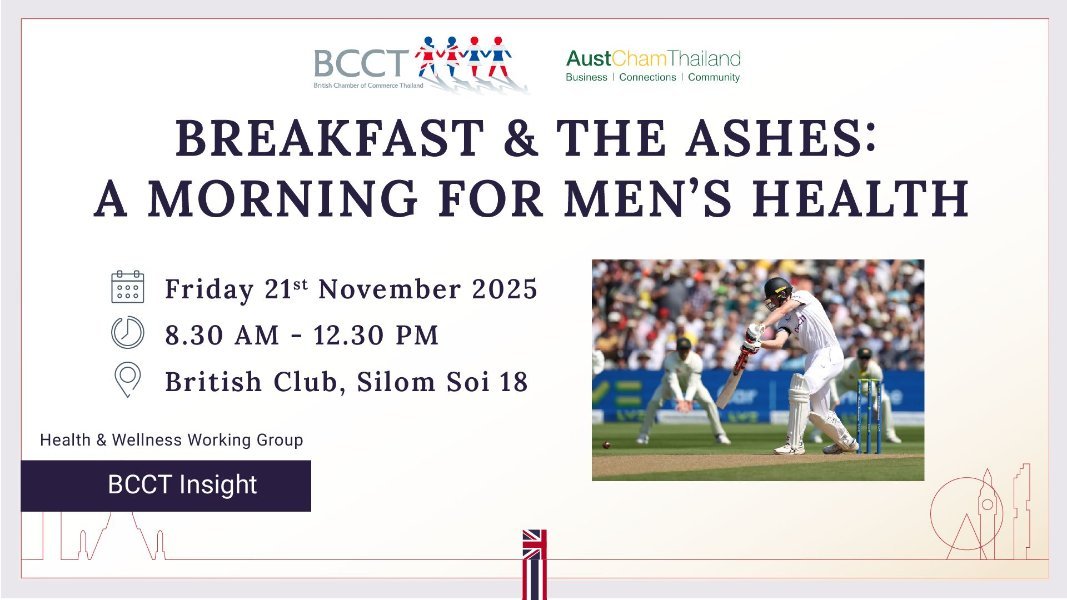 🏏 British Chamber of Commerce Thailand (BCCT) & AustCham Thailand Breakfast & The Ashes: A Morning for Men’s Health Join us for an inspiring morning that combines health, connection, and cricket! The BCCT Health & Wellness Working Group, in collaboration with AustCham, invites you to a special Men’s Health Breakfast — perfectly timed with the first ball of The Ashes 2025. Enjoy an international breakfast buffet, an engaging talk on Men’s Health Awareness, and then stay on to watch the first ball live from Perth! 💬 Topics include: ✔️ Preventive care and early screening ✔️ Mental wellbeing for men ✔️ Healthy lifestyle tips and habits 📅 Event Details Date: Friday 21 November 2025 Time: 8:30 AM – 12:30 PM (breakfast served from 8:00 AM) Venue: The British Club, Silom Soi 18 🎟️ Tickets: THB 1,100 – Breakfast & coffee/tea THB 1,300 – Breakfast + unlimited beers while watching the match 🏏 About The Ashes 2025 The world’s most iconic cricket rivalry returns! England vs Australia — live from Perth. Join us for the first ball of the series and a great morning of camaraderie, conversation, and community. 👉 Book your spot today! BCCT/AustCham members can register online as usual or email [email protected]. Non-members, please contact [email protected] to join. #MensHealth #TheAshes2025 British Chamber of Commerce Thailand (BCCT) AustCham Thailand #HealthAndWellness #BangkokEvents #BritishClub