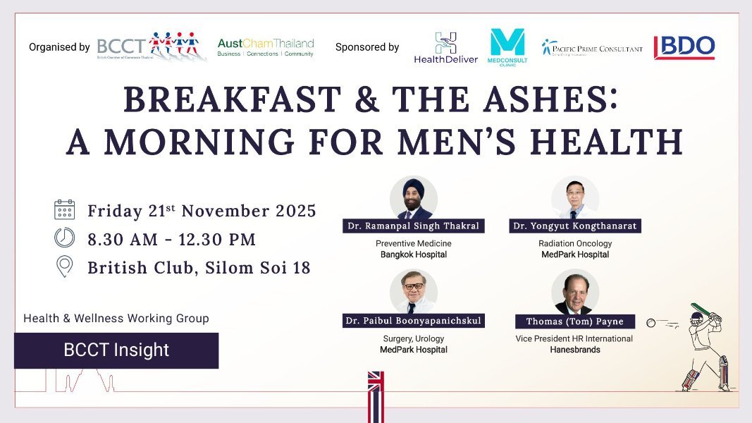 🏏 Men’s Health Breakfast and The Ashes First Ball A morning that brings health, community, and cricket together. Join us for a relaxed and valuable Men’s Health event hosted by The Australian-Thai Chamber of Commerce (AustCham Thailand) and the British Chamber of Commerce Thailand (BCCT). Enjoy breakfast, a short and practical health talk, and then stay to watch the first ball of the Ashes live from Australia. It is a great chance to bring colleagues, clients, friends, or even fathers and sons to an environment where men’s health can be discussed openly and comfortably. 🍽 International breakfast 💬 Men’s Health insights 🏏 Live Ashes first session 🤝 Open to members and non members Want to register? Contact events(at)bccthai.com to register and help you secure tickets. Hope to see you there. Proudly sponsored by HealthDeliver hashtag#MensHealthAwareness hashtag#CommunityWellbeing hashtag#CorporateWellness hashtag#BangkokEvents