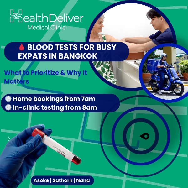 🩸 Blood Tests for Busy Expats in Bangkok: What to Prioritize & Why It Matters Living the expat life in Bangkok comes with its perks—great food, vibrant culture, warm weather—but your health can’t afford to be an afterthought. Between work, travel, and social obligations, many overlook routine health screening. Let’s change that. Here’s your concise, actionable guide to blood testing in Bangkok—what to test, when to test it, and how to keep your results working for you, not against you. 🧠💪 Why Blood Tests Matter More for Expats 🌏 Routine blood tests are the easiest way to keep track of your health, especially when you’re living far from home and adjusting to new risks. ✅ Catch tropical infections early ✅ Monitor chronic conditions like diabetes or high cholesterol ✅ Spot nutrient deficiencies from lifestyle changes ✅ Track hormone shifts due to stress or new routines ✅ Keep clean records for home-country doctors or insurance 🔍 What Should You Test? Here’s what every busy expat in Bangkok should consider as a baseline: 🧪 Core Health Panels Complete Blood Count (CBC): Screens for infection, anaemia, and blood disorders Basic Metabolic Panel (BMP): Checks kidney function, glucose, and electrolyte balance Liver Function Tests (LFTs): Vital in a region with higher hepatitis rates Lipid Panel: Assesses heart health via cholesterol and triglycerides HbA1c & Fasting Glucose: Detects prediabetes and blood sugar trends 🧬 Additional Panels Based on Risk or Symptoms If any of the following apply to you, add these to your panel: 😴 Feeling fatigued, gaining weight, or losing motivation? Thyroid Function Tests (TSH, Free T4 ± Free T3) Sex Hormones (Testosterone, Estradiol, FSH, LH) Morning Cortisol (adrenal fatigue, stress-related issues) 🦠 Living in Thailand full-time? Hepatitis B & C screening (especially if unvaccinated) Dengue, Malaria, Stool Parasite Test (if symptomatic or after travel) STI Panel (based on lifestyle or partner risk) Tuberculosis Screening (if you work in healthcare) 🍺 Regular alcohol use? GGT, ALT, AST to check liver stress AUDIT Score: Ask your doctor about screening for alcohol use risk 📅 How Often Should You Test? Annually for core tests if you're healthy Every 3–6 months for chronic conditions or if on medication Immediately if you have symptoms like fatigue, weight changes, frequent urination, or skin changes Pre-travel or post-exposure: dengue, malaria, parasites, etc. Keep track of your results—trends over time are more valuable than one-off numbers. 🏥 Choosing the Right Clinic in Bangkok When booking a blood test, look for clinics that offer: ✅ Fast turnaround (same-day or next-day results) ✅ English-speaking staff and reports ✅ Online booking and transparent pricing ✅ Guidance on interpreting abnormal values ✅ Add-ons like doctor consultations, vaccination status checks, or hormone reviews ✅ Bonus Tips for Test Day Fast if required (usually 8–10 hours, water allowed) List your medications and supplements Arrive early, especially if walk-in Request English copies of your results Keep a digital copy for future consultations 🧭 Final Thought Your blood work is more than a checklist—it’s a roadmap to long-term wellbeing while living abroad. With the right tests and a reliable clinic, you can stay one step ahead of silent health issues and enjoy all that Bangkok has to offer with peace of mind. 👉 Ready to take control of your health? Make blood testing part of your yearly health ritual—especially if you're juggling travel, work, and tropical life. A quick test today can prevent a major issue tomorrow. 📍Want tailored guidance on blood panels, hormone balance, or infectious disease screening in Bangkok? Ask your clinic what packages fit your age, symptoms, and lifestyle. Read more about health tips for expats and what to expect from medical services in Bangkok in our full article. 🧭 🏥 About HealthDeliver Clinic Bangkok HealthDeliver Clinic is a trusted expat-focused medical centre located near BTS Nana in central Bangkok. We specialise in English-friendly GP services, at-home blood testing, STD and hormone screening, diabetes care, medication refills, and nationwide pharmacy delivery. Our team offers advanced diagnostic packages including GI Map, Dutch OAT, and customised health panels for those seeking efficient, modern care with clear communication. Whether you need a simple check-up or a full chronic care plan, HealthDeliver delivers.