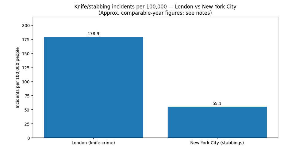 Its difficult to compare stats; the Met Police report "knife crime", which includes robbery and possession, as well as stabbings. New York reports just stabbings. If you use knife crime stats for London, New York, you get this But if you dig into data provided for the House of Commons, where knife injuries data is available (people hurt in the course of a knife crime, so generally a stabbing), you get a different view Knives form about 8% of murders in the US. Most murdered people are shot. When comparing knife crime between UK and US, you always have to remember, murderers in the US much prefer firearms to knives. Murderers in the UK find it much more difficult to access firearms. Ultimately, you have to compare murder rates, with the way people are murdered being irrelevant. So you are left with this https://stevecarter.com/liar.jpg The London murder rate is 1.2 per 100,000. Now before anyone starts gloating that all the US cities listed are blue cities, so-called Republican cities has nothing to write home about. Virginia Beach is cited by the FBI as having a "very low" murder rate, with 3.1 murders per 100,000; more than 2.5 times the London rate, yet Virginia Beach is a seaside town renowned for Spring Break holidays. 45% vote for the Democrats in 2024, Republican Mayor can take the credit for a city where you are almost 2.6 times more likely to end your life than in Khan's London. The most Republican city on my list, with 35% vote for the Libtards, is Tulsa, full of Good Ol' Boys who like nothiabout these numbersng better than listening to a bit of Garth Brookes. 16,5 murders per 100,000. <deleted> hell. Americans have got such a blinker about these numbers, its worth putting this in some perspective. Baghdad many would consider some sort of hellhole. In 2008, the murder rate was 48 per 100k. They've got it down to about 11 per 100k, but that's still the worst in the Arab world. Karachi, a city full of shonky Khyber Pass knock off AKs and AR15, 10 per 100k. Its pretty much the worst in Asia. Damascus is supposed to be up there as well. Still better than Republican Tulsa or Democrat Hartford (23.4 murders/100,000). Kabul; 2021, was about 4 per 100k. Manila; 4.3 per 100k Do I need to hire PMCs when visiting Tulsa? The place where don't want to be is Durán in Ecuador; 148/100k. South Africa is pretty bad in most places. Political choices obviously do play a role in differing murder rates across America, but even stripping that out, its clear many Americans enjoy killing each other, when given the chance. The high rate of gun ownership is clearly a factor, at over 1.2 guns per capita (number 2 is bizarrely the Falklands, with 0.6 guns per capita), but other factors must be at play.
