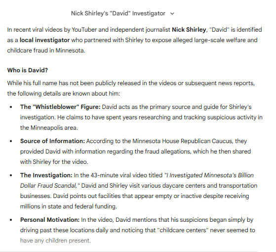So maybe the MSM is treading wearily as they see a possible James O'Keefe situation: 'David' says he is the main source but the MN Republican Caucus says that they are the main source but Nick Shirley says *I* investigated MN $billion fraud scandal