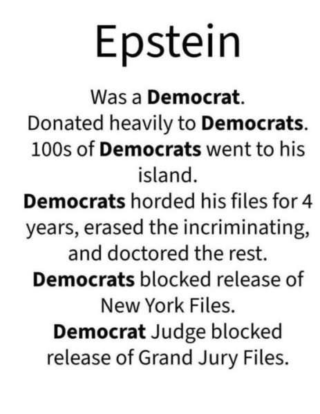 Jeffrey Epstein was a registered democrat who donated heavily to democratic causes and hosted numerous democrats on his island. Epstein's donations exceeded $100,000 to Democrats like Bill Clinton and John Kerry in the 1990s-2000s, Chuck Schumer, and others like Hakeem Jeffries soliciting donations from Epstein, with flight logs showing 26 trips by Clinton, Redi Hoffman and 100's of other democrats. Epstein hated Trump, Epstein was a democrat financier, and he was even covertly feeding lines by SMS to members of congress mid-hearing to damage Trump. Epstein was in bed with the democrats, not Trump. Their new talking point is that Trump was mentioned 38,000+ times in the Epstein files. Yeah sure they were, because Epstein and the democrats were emailing each other all day about how they must destroy Trump. The files prove Epstein was a democrat puppeteer. No matter what Trump does with the files it will never be good enough for the democrats and Trump deranged sufferers. In fact, what was discovered was democrats colluding with Epstein to get Trump but NO ONE is talking about that. Jeffrey Epstein was a democrat. He donated heavily to democrats. 100’s of democrats visited his island. The democrats hoarded his files for 4 years, erased anything that incriminated themselves, and doctored the rest. The democrats blocked release of the New York files. A democrat judge blocked the release of Grand Jury Files. Hoffman is just one of the democrats darlings. The democrats wanted these files opened and now we are all seeing who was behind the pedophilia with Epstein. It was these monsters that the democrats have been protecting all along. Were democrats blackmailing these monsters ? Fund the democrat Party or else ? https://docs.house.gov/meetings/JU/JU08/20250227/117951/HHRG-119-JU08-20250227-SD004-U4.pdf