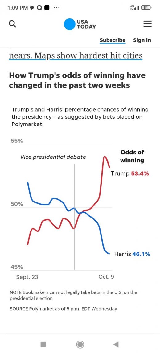 3. What a difference a week made. https://www.app.com/story/news/politics/2024/10/09/presidential-election-2024-odds-kamala-harris-donald-trump-oct-9-update/75397605007/