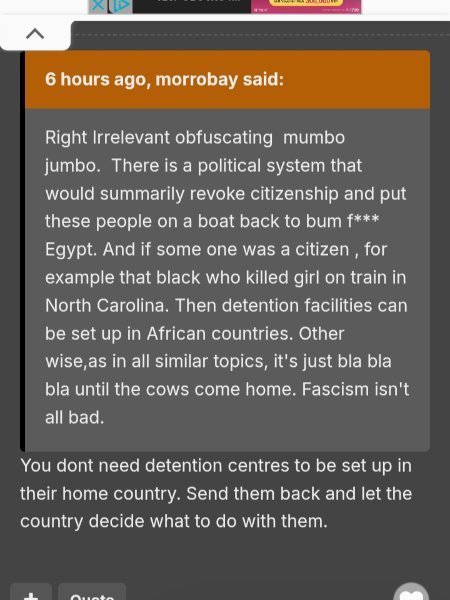 Right Irrelevant obfuscating mumbo jumbo. There is a political system that would summarily revoke citizenship and put these people on a boat back to bum f*** Egypt. And if some one was a citizen , for example that black who killed girl on train in North Carolina. Then detention facilities can be set up in African countries. Other wise,as in all similar topics, it's just bla bla bla until the cows come home. Fascism isn't all bad.