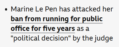 Perhaps they shouldn't ban people from politics just because they are right of centre and popular? Marine Le Pen attacks five-year ban from running for public office as 'political decision' - BBC News They created this situation and personally I am enjoying Macron slipping and sliding around in his own mess.